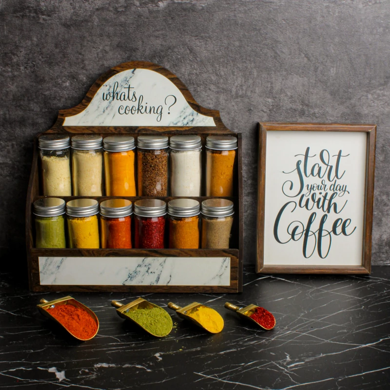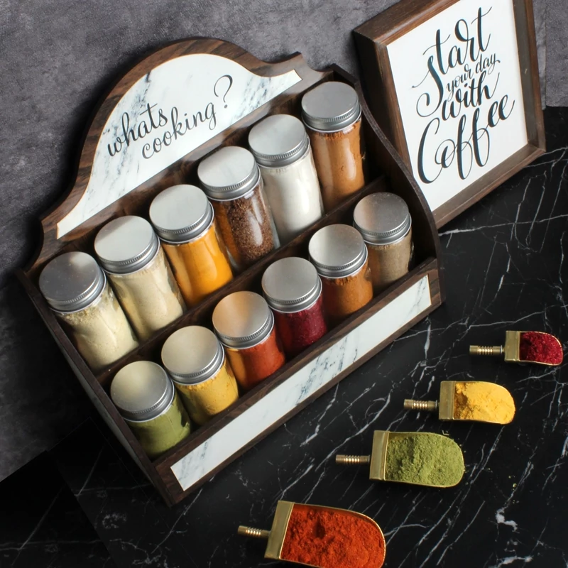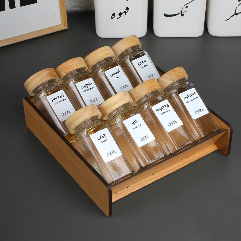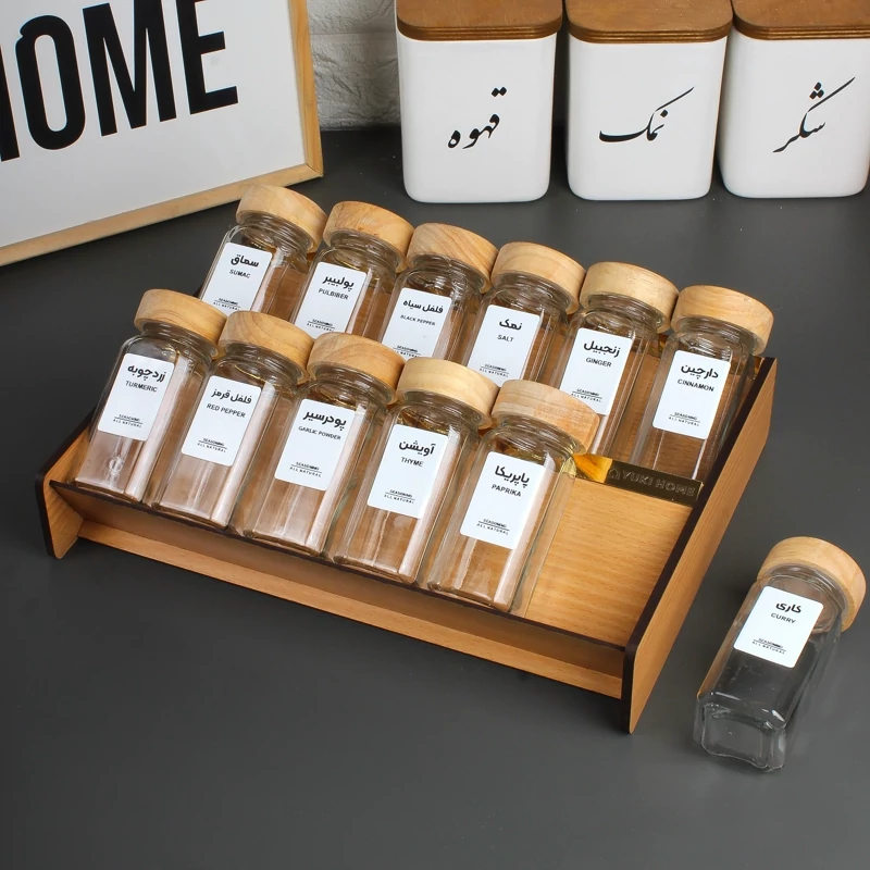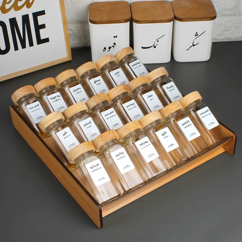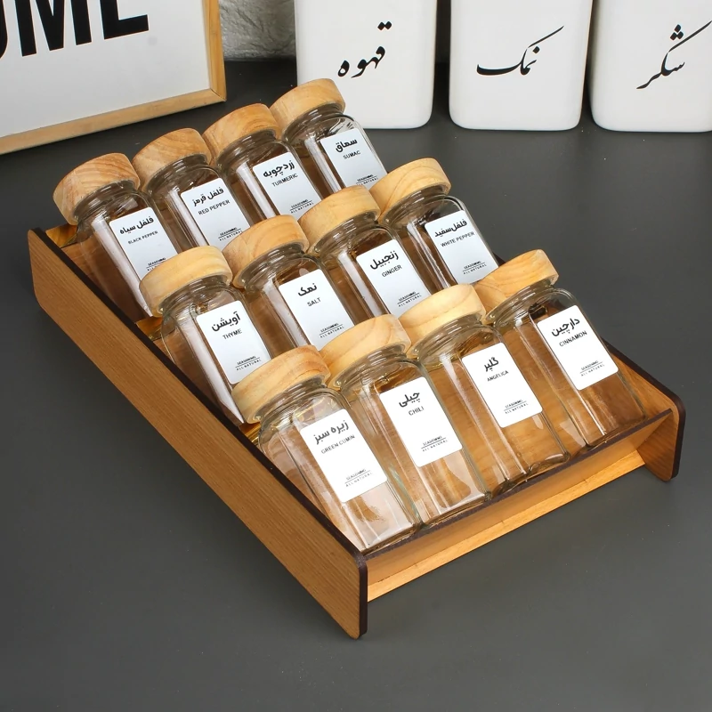 استند چوبی داخل کشویی ادویه به همراه شیشه و لیبل