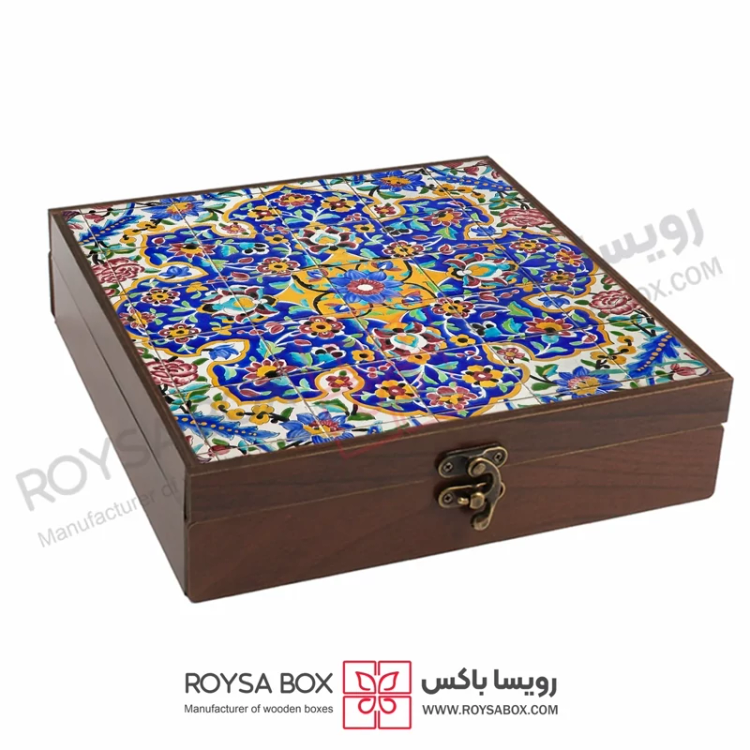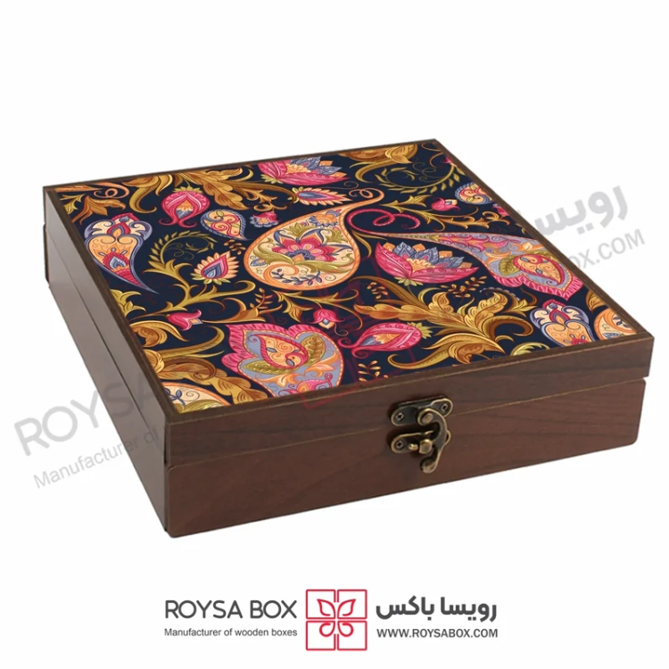 این جعبه دارای طرح و نقوش ایرانی میباشد و کلیه طرح ها چاپ مستقیم روی چوب میباشد.